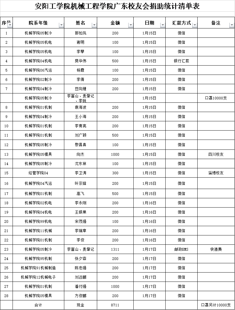 病毒无情,人间有爱。新冠肺炎疫情发生以来,广大员工一直心系母校,并用实际行动积极支持母校的疫情防控工作。1月15日广东员工会会长原yl23455永利05级制冷专业李富山等人从网络上看到关于安阳疫情报道的新闻,第一时间对公司表达了慰问,了解到当前安阳防疫物资紧缺的情况,马上组织相关人员进行防疫物资捐赠筹划。经过精心筹备募捐,截止17日,共筹集了53319支口罩的经费,现在捐赠的口罩已经通过快递邮寄公司员工办。